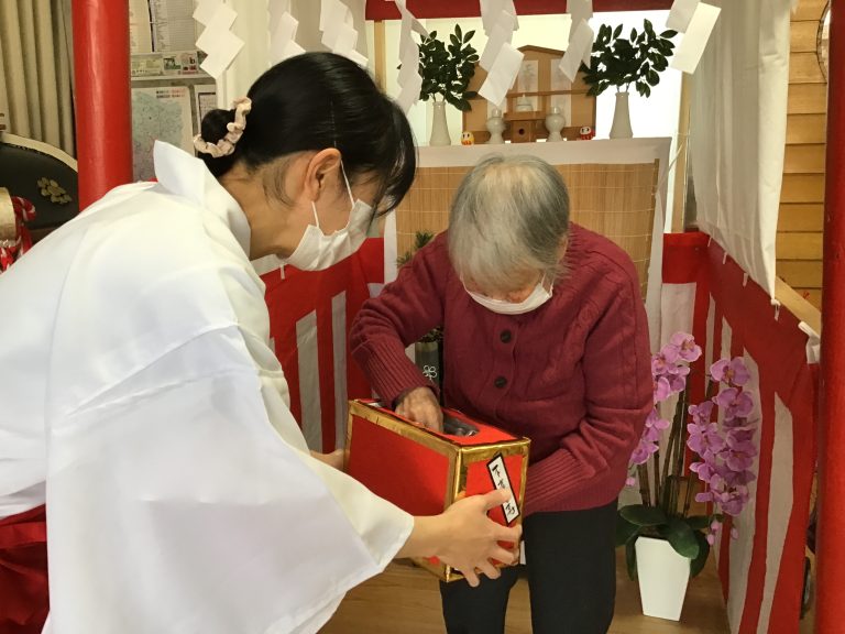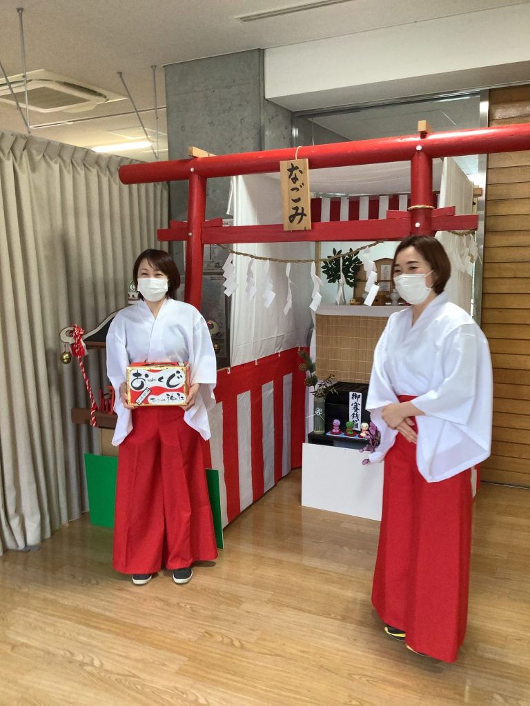 なごみ正面玄関に設置した神社で参拝とおみくじを引いていただきました。