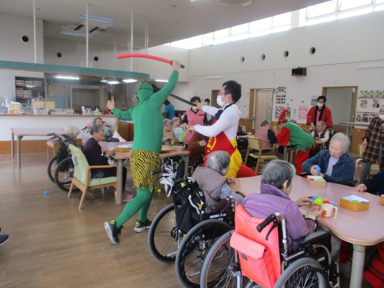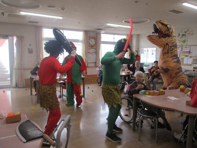 毎年恒例の豆まき会を実施しました。今年は鬼の他に恐竜?加わりパワーアップ!