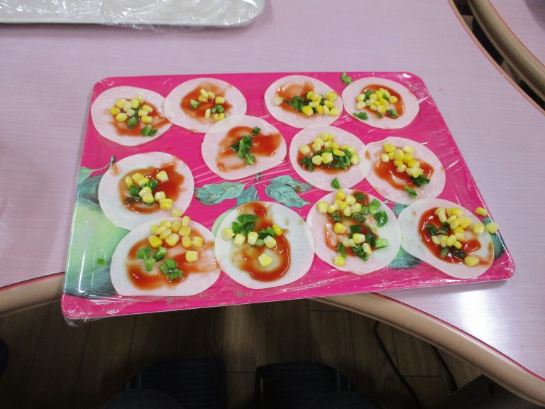 手作り体験で「かんたんピザ」を作りました。