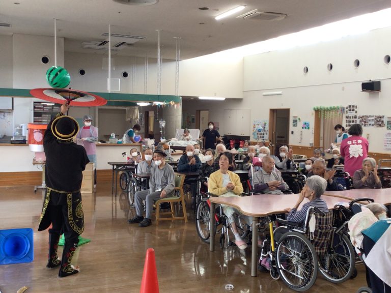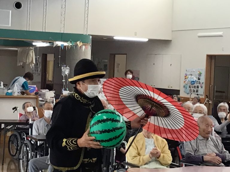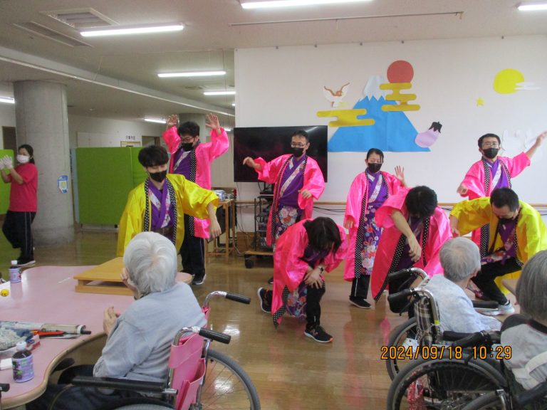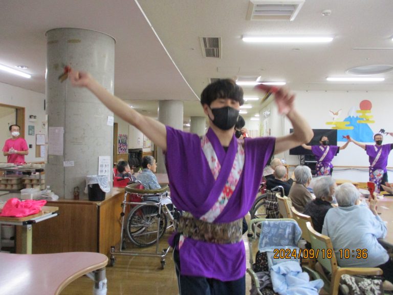 ご利用者様のカラオケ、職員によるよさこいソーラン、スコップ三味線、弾き語り、ものまね、パントマイムなどで大いに盛り上がりました。