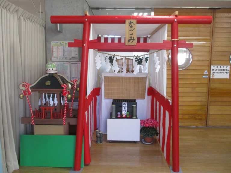 なごみ正面玄関になごみ神社と門松を展示しました。