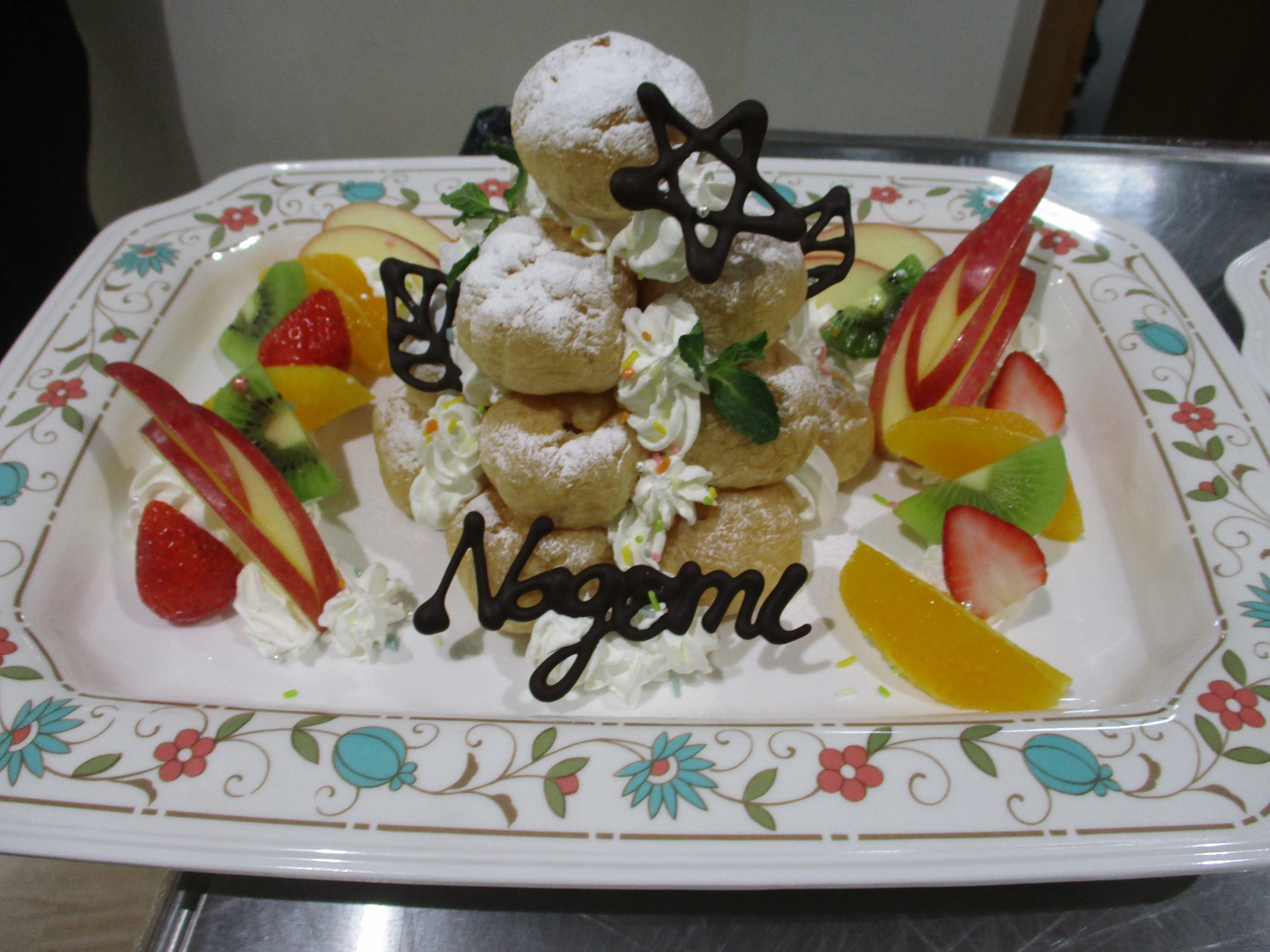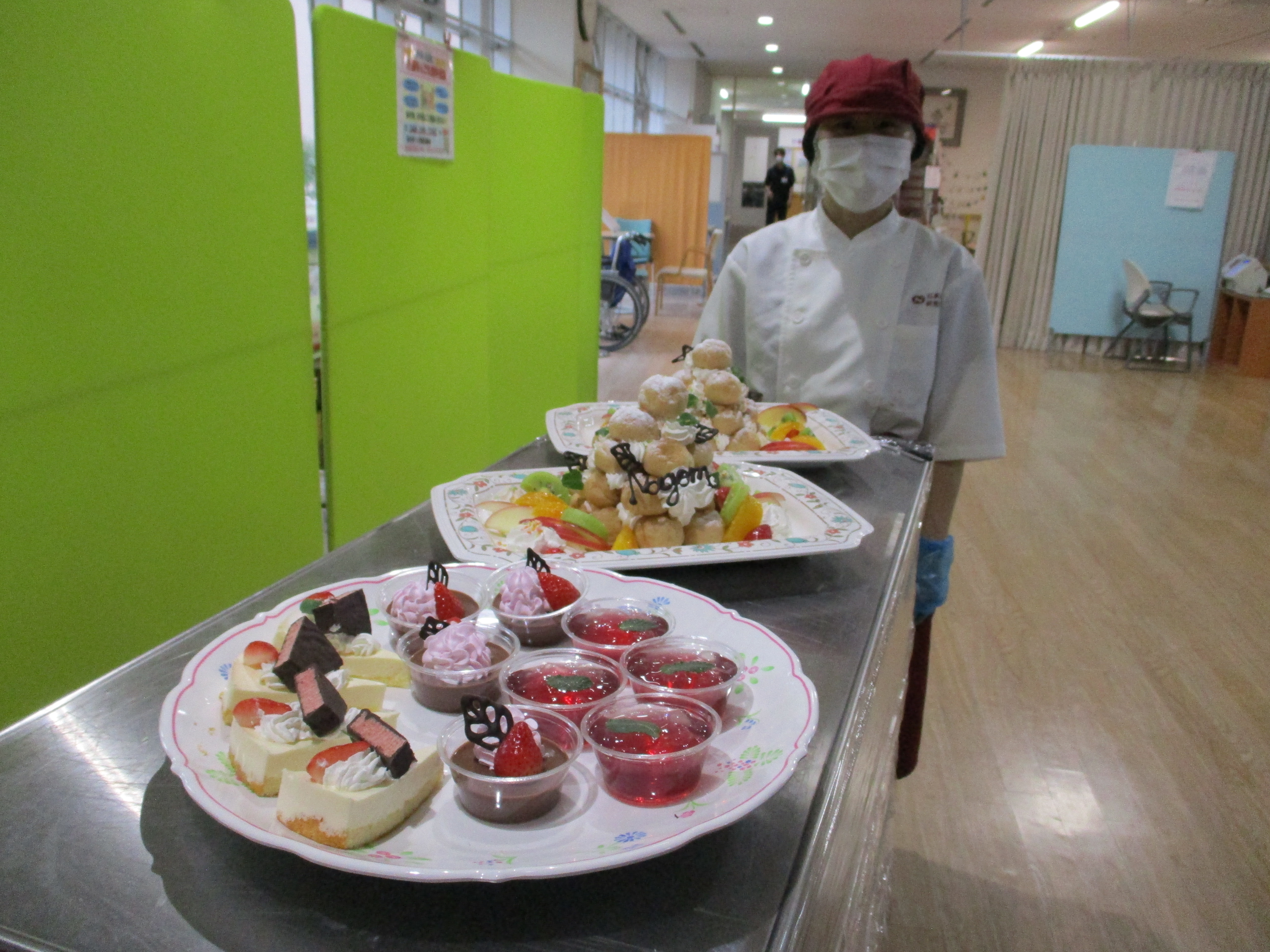 おやつバイキングは、厨房棟のパティシエさんが作ったシュークリームタワーやパンナコッタチョコレート、ベリーミックスゼリー、チーズケーキを提供させていただきました。