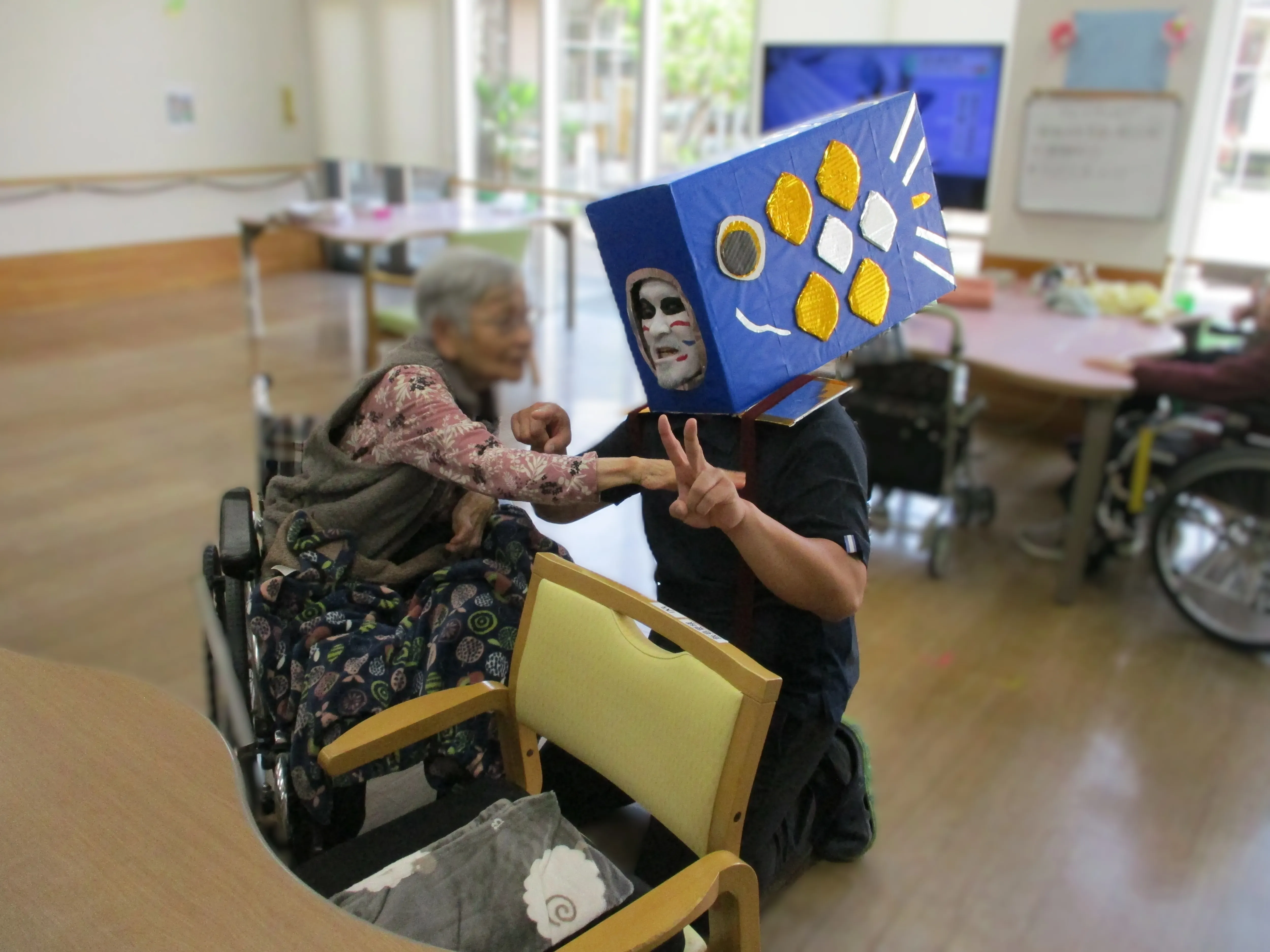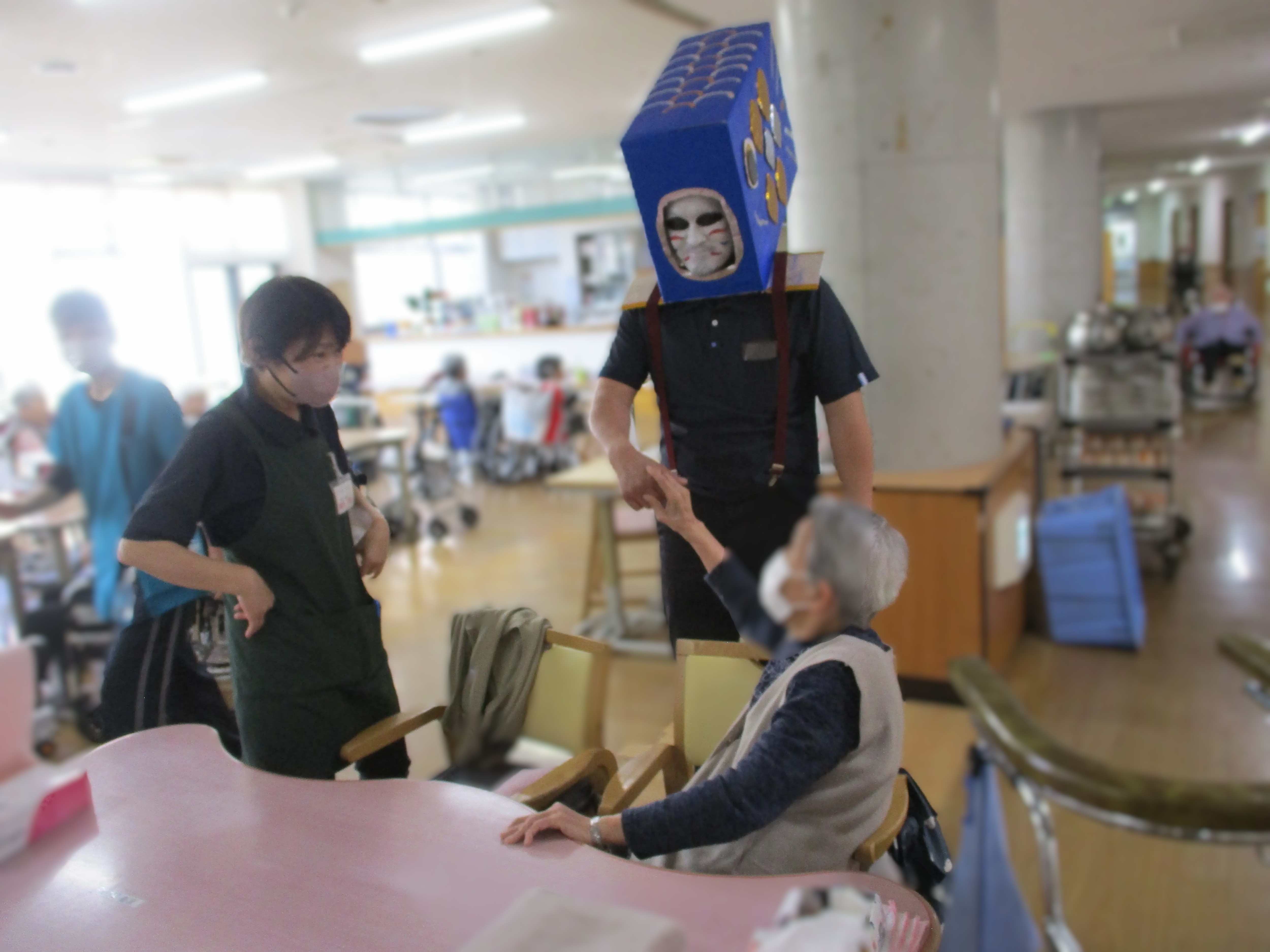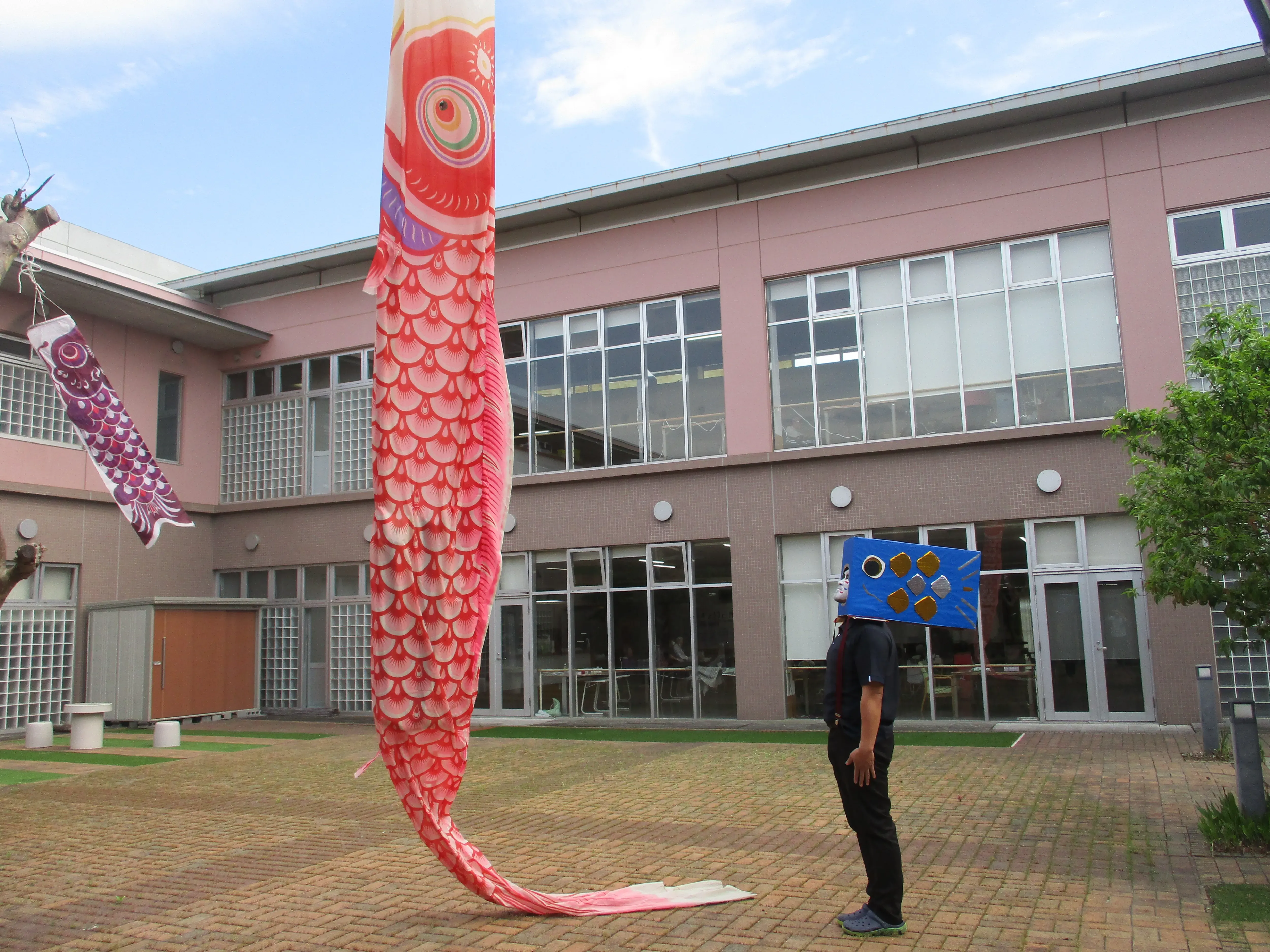 中庭には本物の鯉のぼりを設置し、鯉の被り物をした職員も登場(鯉のぼるさん)!!